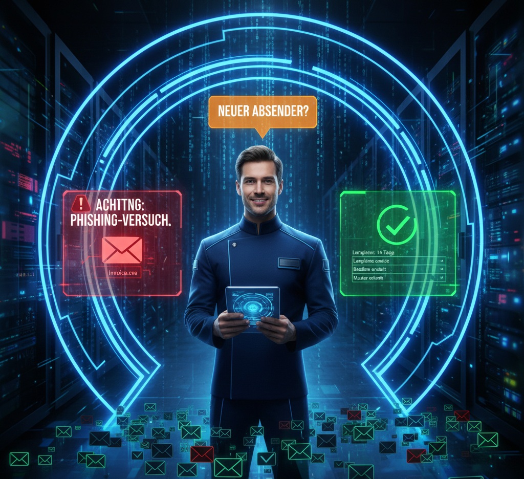 „Neuer Absender“ ist der freundliche Türsteher im Posteingang: Er blockiert nicht automatisch jede Mail, aber er macht sichtbar, wenn ein Absender für dieses Postfach nicht zum üblichen Kommunikationsmuster passt. Genau dort landen häufig Phishing- und BEC-Mails („Chef-Masche“).