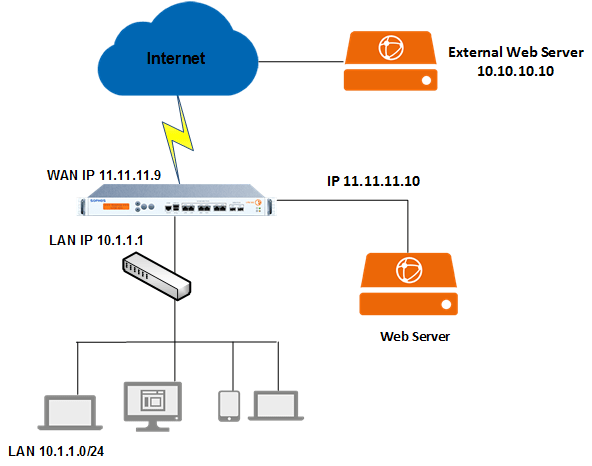 In diesem Beispiel haben wir eine WAN-Schnittstelle mit eine hinterlegten IP-Bereich 11.11.11.9-11.11.11.14. Der komplette ausgehende Verkehr läuft über die 11.11.11.9. Der Web-Server, mit der 10.10.10.10 blockt die IP 11.11.11.9 aufgrund bestimmter Einschränkungen. Um die Verbindung zwischen dem Web Server und dem Netzwerk herzustellen, muss dem ausgehenden Verkehr eine andere IP zugewiesen werden.