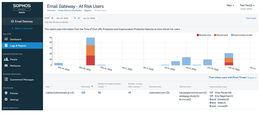 Der verbesserte „Benutzer mit hohem Risiko“-Bericht gibt tieferen Einblick in diese Phishing Bedrohungen, mit einer Zusammenfassung aller Täuschungsversuche die empfangen wurden, sowie ein Überblick aller User, die entweder gewarnt oder beim besuchen von verdächtigen URLs blockiert wurden. Tiefgreifendere Level geben weiterhin Aufschluss über: