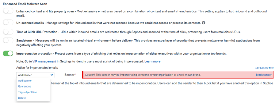 - Die Standardrichtlinienaktion ist „Banner hinzufügen“ um Benutzer vor eingehenden Emails, die einen Täuschungsversuch mittels Identitätsdiebstahl enthalten, zu warnen. Dieses Banner kann im Sophos Email Administrator angepasst werden.