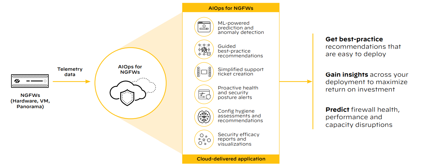 AIOps for NGFW ist ein Cloud-basiertes Modul und stützt sich auf Telemetriedaten von Hardware-Firewalls (PA-Serie), Software-Firewalls (VM-Serie) und unserer Verwaltungsplattform (Panorama™). Die Daten gehen an unsere AIOps-Cloud, wo wir Algorithmen des maschinellen Lernens anwenden, um Empfehlungen zu erstellen und Anomalien. AIOps für NGFW wird vollständig von PAN-OS® Telemetrie unterstützt.