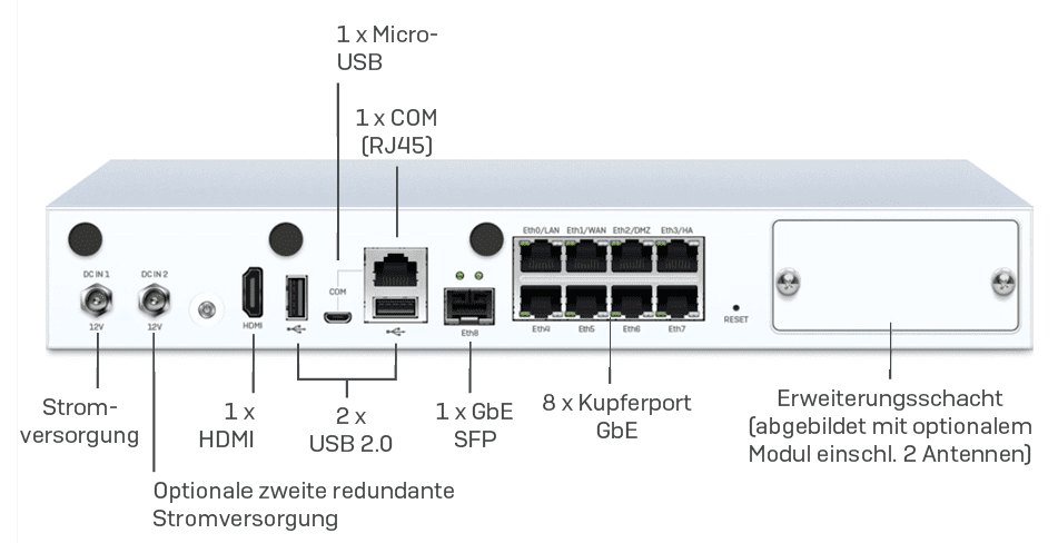 - Bei allen SG/XG 125/135-Modellen gibt es für 3G/4G-Module einen Erweiterungsschacht, der in vielen Bereitstellungsszenarien als zusätzliche Anschlussmöglichkeit dient.