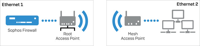 Wenn Sie zwei Access Points nutzen, können Sie zwischen zwei Ethernet-Segmenten eine WLAN-Verbindung herstellen. Eine WLAN-Bridge ist nützlich, um zwei Ethernet-Segmente miteinander zu verbinden, wenn keine Kabel verlegt werden können. Das erste Ethernet-Segment von Sophos XG Firewall wird mit der Ethernet-Schnittstelle des Root-Access-Points verbunden, das zweite Ethernet-Segment mit der Ethernet-Schnittstelle des Mesh-Access-Points. Je mehr Mesh-Access Points Sie nutzen, desto mehr Ethernet-Segmente können Sie verbinden.