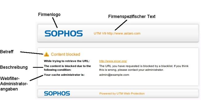 Hierbei handelt es sich um den Text unterhalb des Firmenlogos auf der Standard-Fehlermeldungsseite, die vom Browser angezeigt wird, wenn ein Benutzer eine Website öffnet, die vom Virenscanner oder dem Inhaltsfilter von Sophos UTM blockiert wird. Sie können hier z.B. die Kontaktdaten des Administrators eintragen.
