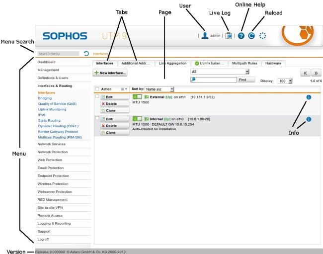 Der WebAdmin ist die webbasierte grafische Benutzeroberfläche zur vollständigen Administration von Sophos UTM. Der WebAdmin besteht aus einem Menü und mehreren Seiten, von denen manche wiederum mehrere Registerkarten (engl. tabs) besitzen. Das Menü auf der linken Seite orientiert sich in logischer Reihenfolge an den Produktmerkmalen von Sophos UTM. Sobald Sie auf einen Menüpunkt wie z.B. Network Protection klicken, öffnet sich ein Untermenü und die entsprechende Seite wird angezeigt. Beachten Sie, dass für einige Menüpunkte keine eigene Seite vorhanden ist. In diesem Fall wird weiterhin die zuvor ausgewählte Seite angezeigt. Erst wenn Sie ein Untermenü anklicken, öffnet sich die dazugehörige Seite, und zwar mit der ersten Registerkarte.