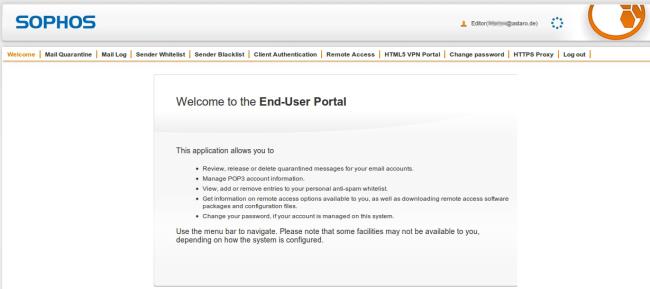 Das Benutzerportal von Sophos UTM ist eine besondere Browser-basierte Anwendung, die autorisierten Benutzern personalisierte E-Mail-Dienste und Dienste für den Fernzugriff zur Verfügung stellt. URL der möglich, zum Beispiel https://192.168.2.100. (Beachten Sie das HTTPS-Protokoll und die fehlende Portnummer 4444, die Sie üblicherweise eingeben würden, um auf die WebAdmin-Schnittstelle zugreifen zu können.) Der Zugriff ist über die URLUniform Resource Locator der Sophos UTM möglich, zum Beispiel https://192.168.2.100. (Beachten Sie das HTTPS