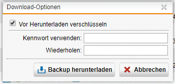 - Das Fenster Download-Optionen öffnet sich. Es besteht die Möglichkeit, das Backup unverschlüsselt (als .abf-Datei) oder verschlüsselt (als .ebf-Datei) herunterzuladen.
