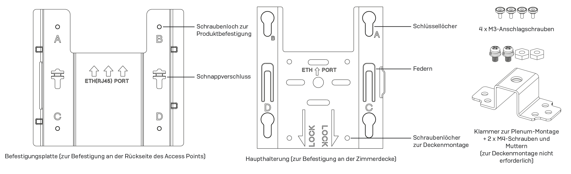 Zur Plenum-Montage Ihres Access Points nutzen Sie bitte dieses Montage-Kit zur flachen Deckenmontage und zur PlenumMontage. Der Plenum-Montage-Kit muss von einem qualifizierten Techniker montiert werden.